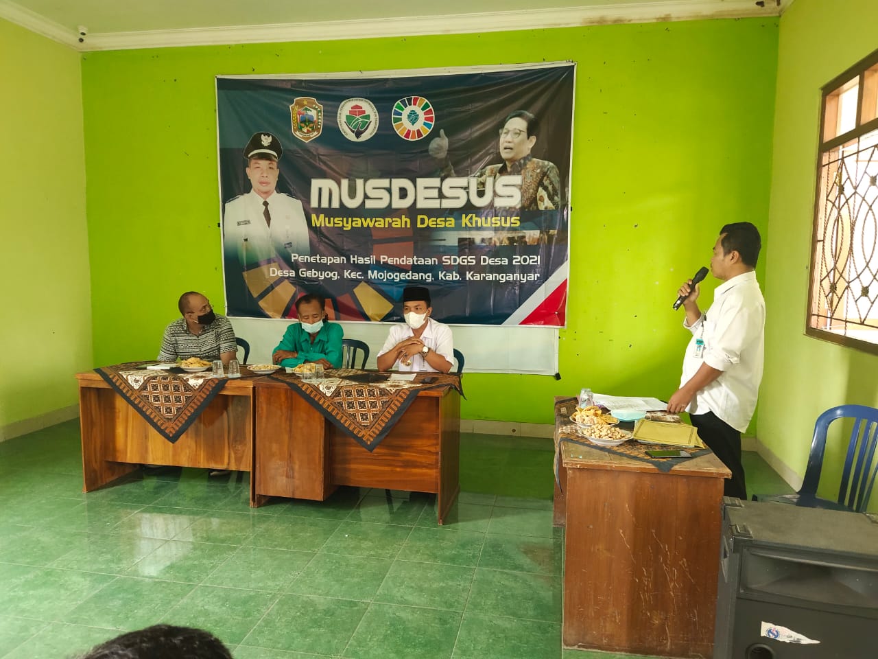 MUSDESUS Pendataan SDGS Desa Gebyog Kecamatan Mojogedang Yang Di Laksanakan Pada Hari Rabu 07 Juni 2021 jam 12.30 Di aula Kantor Desa Gebyog Peserta 1.Kepala Desa Dan Perankat Desa Gebyog ,RT dan Karangtaruna Tim Dari Kecamatan Mojogedang Pembawa Acara Bpk Sriyono,S.Pd ( Sekdes Desa Gebyog ) Sekaligus Pembukaan Acara Acara 1.Sambutan Kepala Desa Gebyog ( Bpk. Sugiyarto ) 2.Acara Inti Penyerahan Buku Pendataaan Oleh Bpk Ketua BPD Desa Gebyog ( Bpk Suparno )