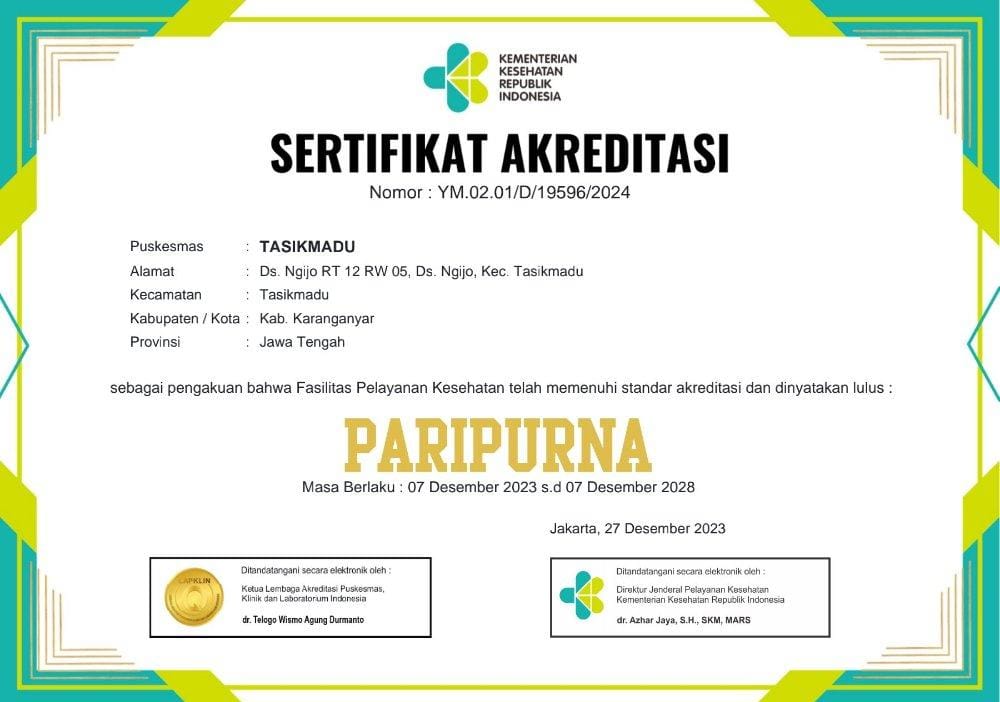 SERTIFIKAT AKREDITASI PUSKESMAS TASIKMADU 2023